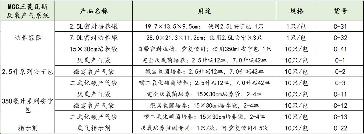 目前,MGC AnaeroPack系列產(chǎn)品有厭氧培養(yǎng)、微需氧培養(yǎng)、二氧化碳培養(yǎng)三大類,2.5升和350毫升兩個(gè)系列以及配套的密封培養(yǎng)罐、培養(yǎng)袋和氧氣指示劑。